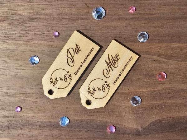Perfect for events and weddings, our wooden name tags are able to be customised with any initials for your own bespoke monogram, or a design of your choice. Please make sure to send us your full guestlist (with surnames if you wish for them to be included) in the customisation box below, or via email.